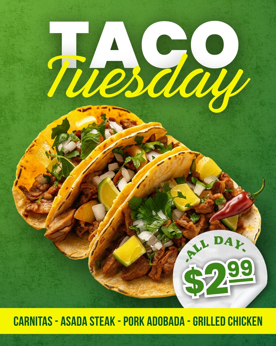 Taco Tuesday! $2.99 all day. Carnitas | Asada Steak | Pork Adobada | Grilled Chicken